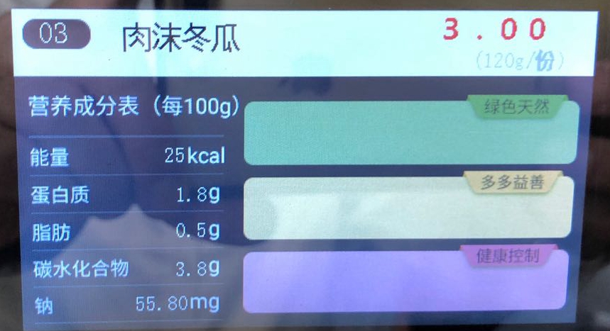 餐厅所有菜品都经过营养分析并按照要求标准化制作,录入系统。点餐台配有智能显示屏,对当前菜品的营养成分,通过点餐柜台电子屏幕进行展示,营养成分一目了然,食者可根据个人每日营养摄入情况选择;通过刷餐卡和智能餐盘进行绑定,在取餐结算时,智能餐台可以自动识别菜品并扣费。