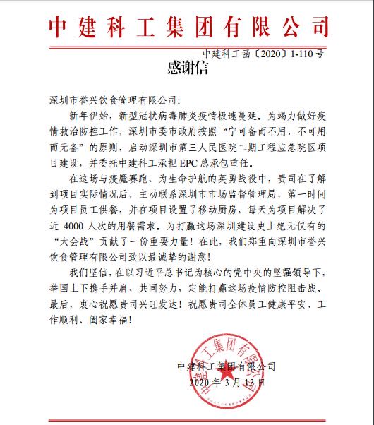 在整个供餐过程中,誉兴集团以优质的服务,专业的能力和精美的餐食,赢得了市食药局、中建科工集团的高度认可和赞誉!也收到了中建科工集团的表扬信!